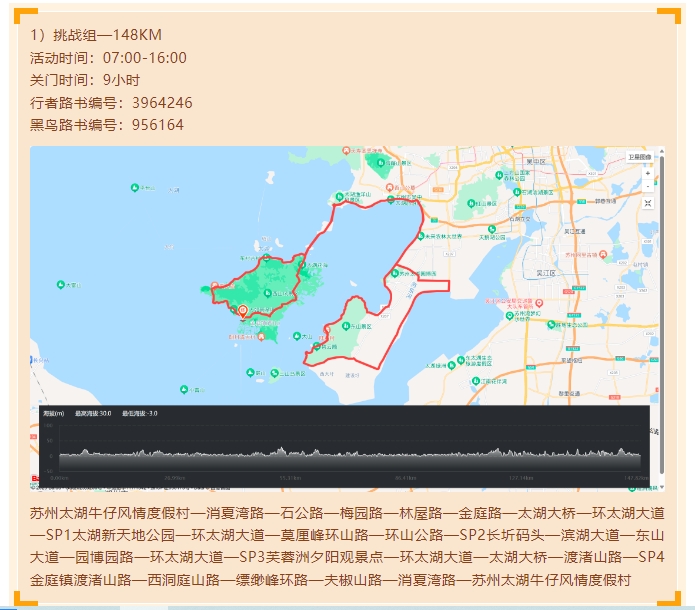 线路:苏州太湖牛仔风情度假村—消夏湾路—石公路—梅园路—林屋路—金庭路—太湖大桥—环太湖大道—SP1太湖新天地公园—环太湖大道—莫厘峰环山路—环山公路—SP2长圻码头—滨湖大道—东山大道—园博园路—环太湖大道—SP3芙蓉洲夕阳观景点—环太湖大道—太湖大桥—渡渚山路—SP4金庭镇渡渚山路—西洞庭山路—缥缈峰环路—夫椒山路—消夏湾路—苏州太湖牛仔风情度假村