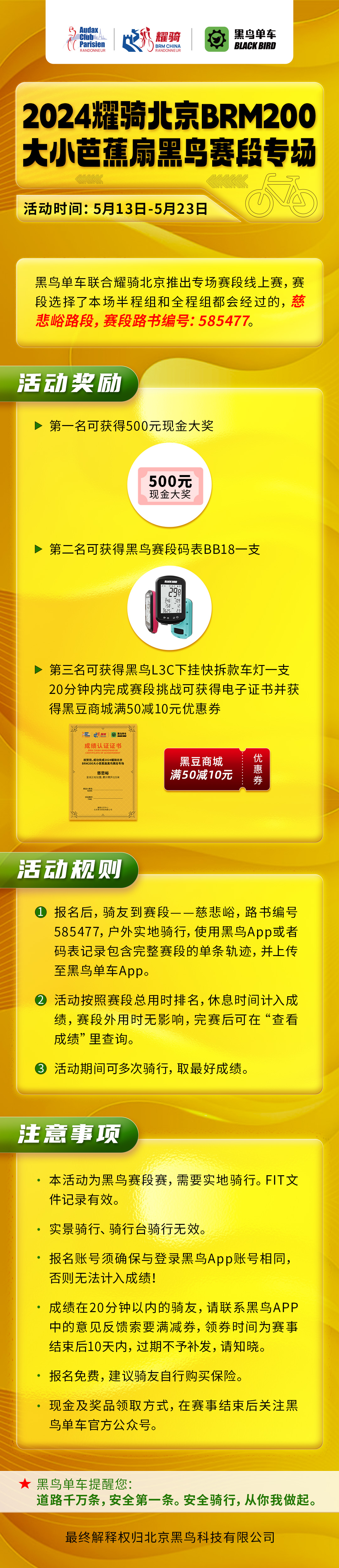 1、本次活动为非营利自助户外活动; 2、领队是指本次活动的总领队、分领队和总收队,发起人是指本活动的发布人; 3、户外运动有一定的危险性和不可预知性,参加者对自己的行为及后果负完全责任; 4、领队和发起人不对任何由户外运动本身具有的风险以及往返路途中发生的危险所产生的后果承担法律上和道德上的责任; 5、骑行活动中所有队员要听从领队和发起人的指挥,发生争议现象,由领队和发起人集体商议解决; 6、对于不服从安排、不同意劝退的人员,领队和活动发起人不承担任何责任; 【未成年人附加免责声明】 1、18周岁以下的未成年人,必须由监护人陪同,或具有由监护人签字的书面免责声明,否则不能参加活动; 2、对于参加活动但又存在隐瞒真实年龄、提供虚假监护人或者伪造监护人签字等欺骗行为的未成年人,领队和发起人不承担任何法律上和道德上的责任; 3、原则上未成年人不能发布活动,不能成为总领队、分领队以及总收队; 4、请车友谨慎参加由未成年人发起的活动,并请自己承担风险;