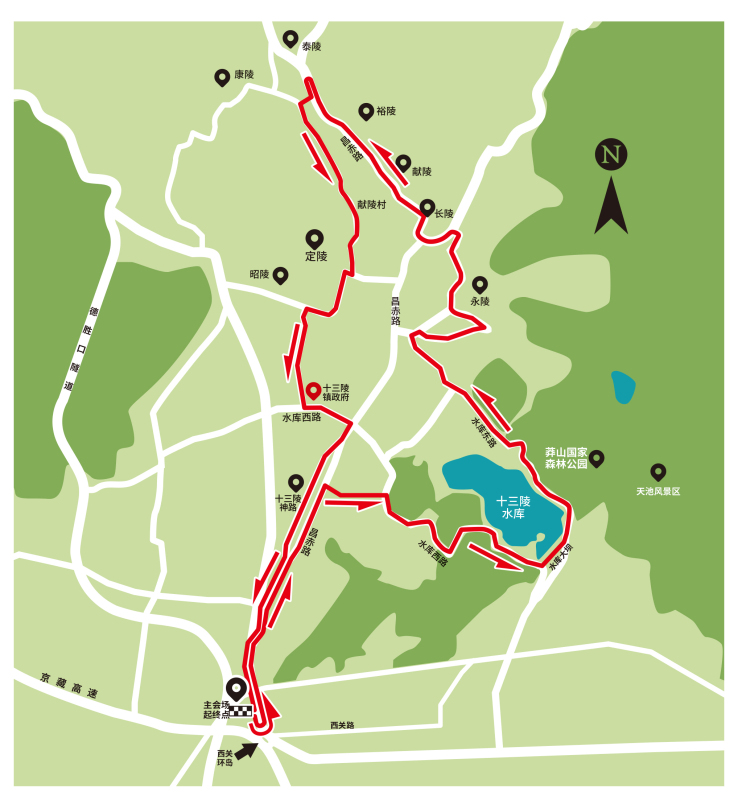 悦荟湾→西关环岛掉头→大红门 →神路→南新村路口→大坝→北新村→德陵→永陵→景陵→长陵→泰陵掉头→定陵→昭陵→十三陵镇政府→胡庄路口→神路→悦荟湾