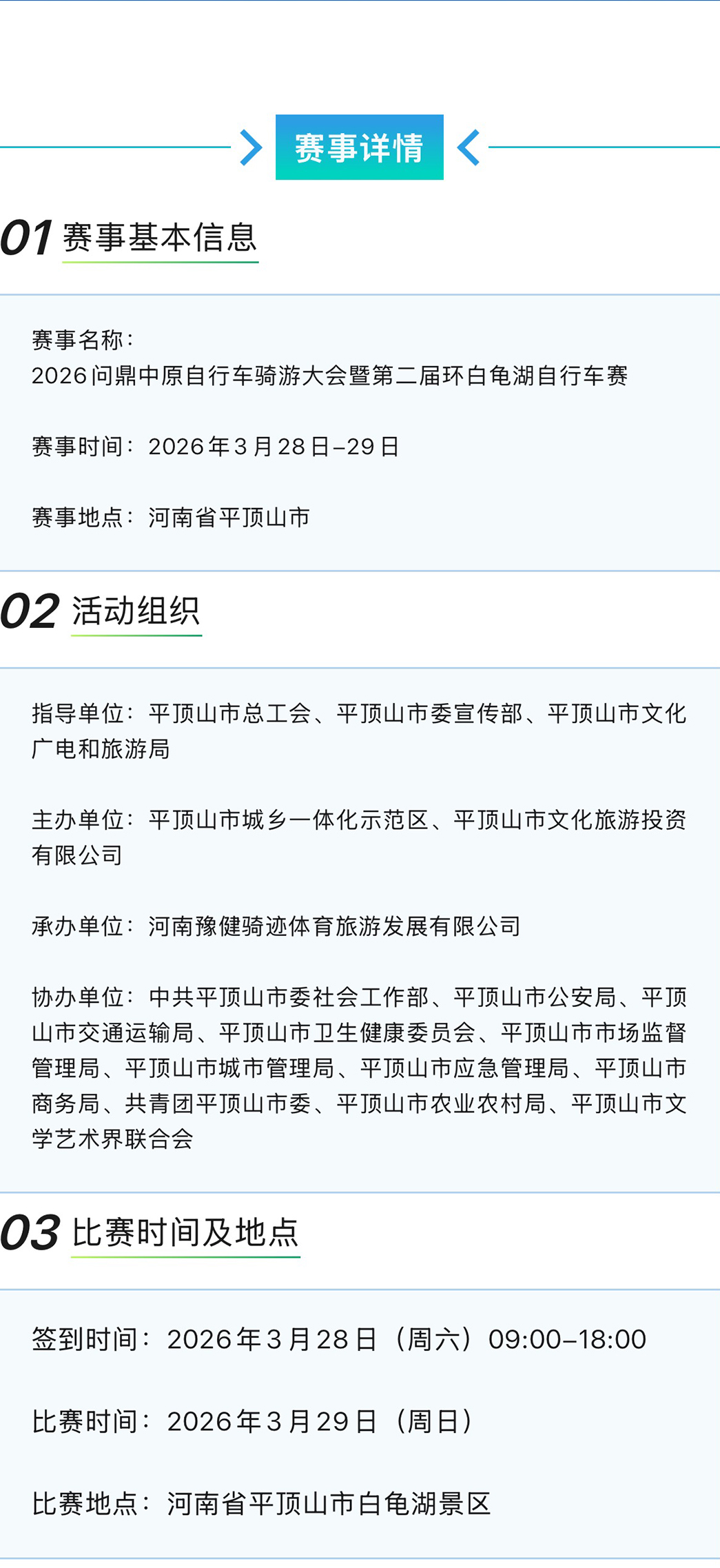 免责协议 “骑聚白龟湖 醉美紫荆开”2026问鼎中原自行车骑游大会暨第二届环白龟湖自行车赛 1、我自愿参加2026问鼎中原自行车骑游大会暨第二届环白龟湖自行车赛及一切赛事相关活动,我确认本人具有参加本次赛事相应的民事能力和民事责任能力,并且已获得监护人的同意。 2、我确认全面理解并同意遵守组委会及相关组织单位(以下统称“主办方”)所制订的各项规程规则、规定、要求及采取的措施。 3、我确认已认真阅读了主办方就选手参加本次赛事可能发生的一切风险的提示,我在此明确同意将自行承担参加2026问鼎中原自行车骑游大会暨第二届环白龟湖自行车赛所可能存在的风险和责任。 4、我承诺已通过正规医疗机构进行体检,并结合检查报告进行自我评估,确定自己的身体状况能够适应于骑行运动,已为参赛做好准备,承诺愿意承担大会可能带来的风险;以下疾病患者不能参赛:⑴先天性心脏病和风湿性心脏病患者;⑵高血压和脑血管疾病患者;⑶心肌炎和其它心脏病患者;⑷冠状动 脉疾病患者和严重心律不齐者;⑸血糖过高或糖尿病患者;⑹家属不同意其参加者;⑺其他不适合运动的疾病患者。 5、我将向主办方提供身份证件用于核实本人身份及参赛资格,保证提交的身份证件和文件资料真实有效,并承担因提供不实信息所产生的全部责任,主办方有权拒绝参赛,并不予退返报名费。 6、我承诺以本人的名义报名参赛,不将报名后获得的参赛资格及号码牌以任何方式转让给他人,并承担因转让参赛资格及号码布所出现的全部责任与后果。 7、我同意在比赛前和比赛期间不得损害、更改及遮盖号码牌,并同意组办方发现该项违规后有权取消本人的参赛资格。 8、我参加此次比赛以及参赛全过程所发生的人身伤害,局部或永久性伤残,死亡,医疗或住院费用,财产损坏,任何形式的盗窃或财产损失等事项,由我自己承担全部责任,免除主办方责任,组办方对此不承担任何形式的赔偿。 9、我同意在参赛过程中遵守裁判,医疗人员和安保人员的要求,在关门时间未完成比赛,身体不适及赛道出现突发状况时主动退出比赛,并承担因本人坚持比赛所产生的全部责任与后果。 10、我同意接受主办方在比赛期间提供的现场急救性质的医务治疗,但在医院救治等发生的相关费用由我自理。 11、我授权赛事组办方及指定媒体无偿使用本人的肖像、姓名、声音等用于问鼎中原自行车赛事的宣传与推广。 12、本次比赛赛事主办方为每一位参赛人员购买定额保险,当由于出现各种意外事故、突发气候变化和急性疾病等不可预测因素造成参赛人员身体损害时,承办方有义务尽力救助,但如果造成不可逆转的损害,参赛人员将接受保险公司范围以内的赔偿,并不再另行向赛事组委会或承办方主张赔偿或追究其他责任,同时当事人永远免除此次赛事组委会和承办方的任何法律连带责任。 13、本人承诺该免责协议由本人签署,并非他人代签,所产生的一切后果由本人承担,与主办方无关。 我已认真阅读已上内容,并同意。