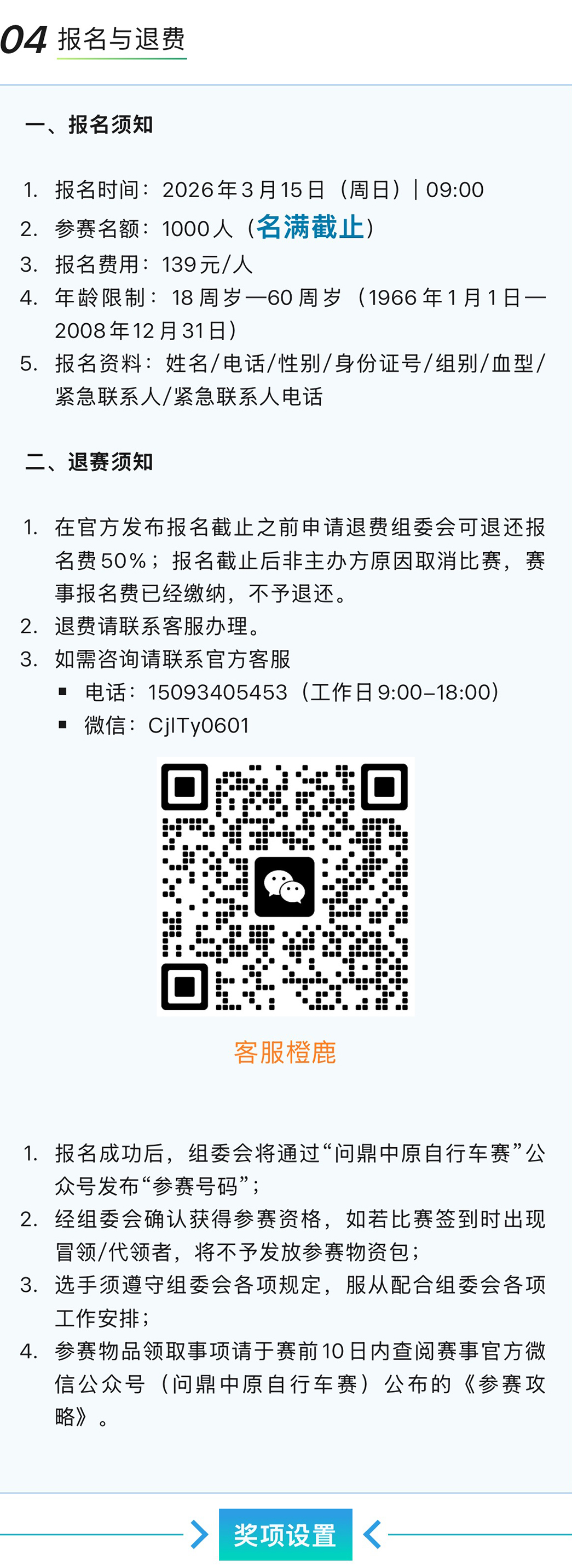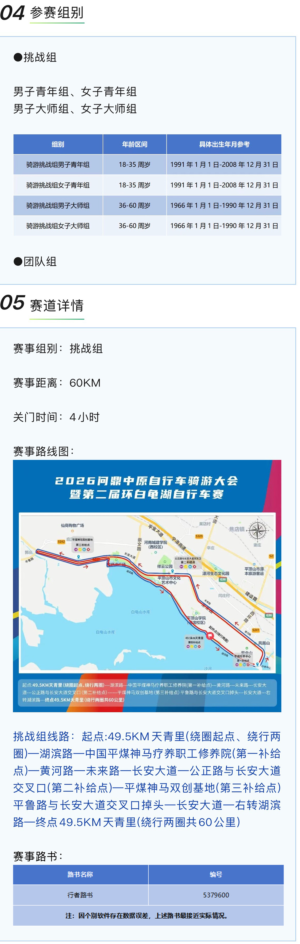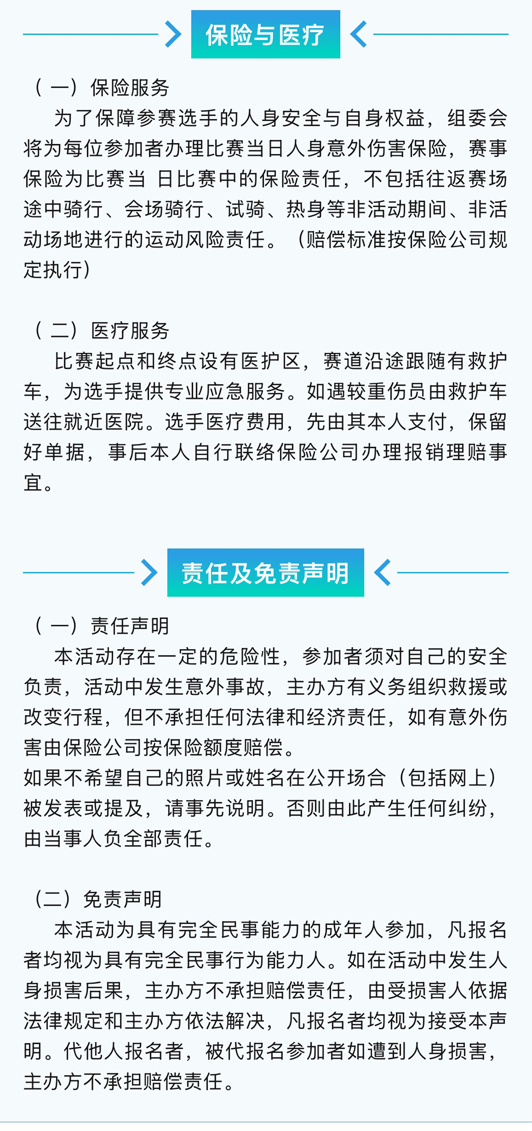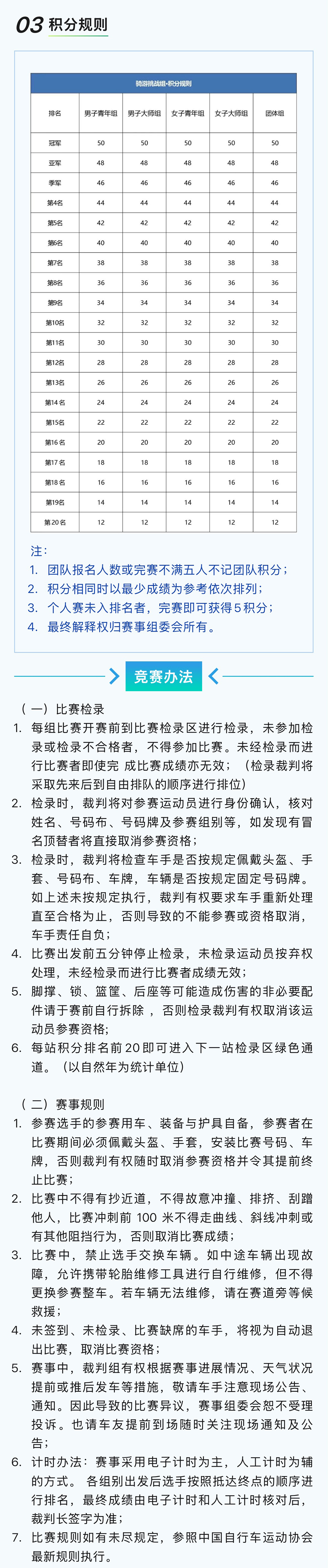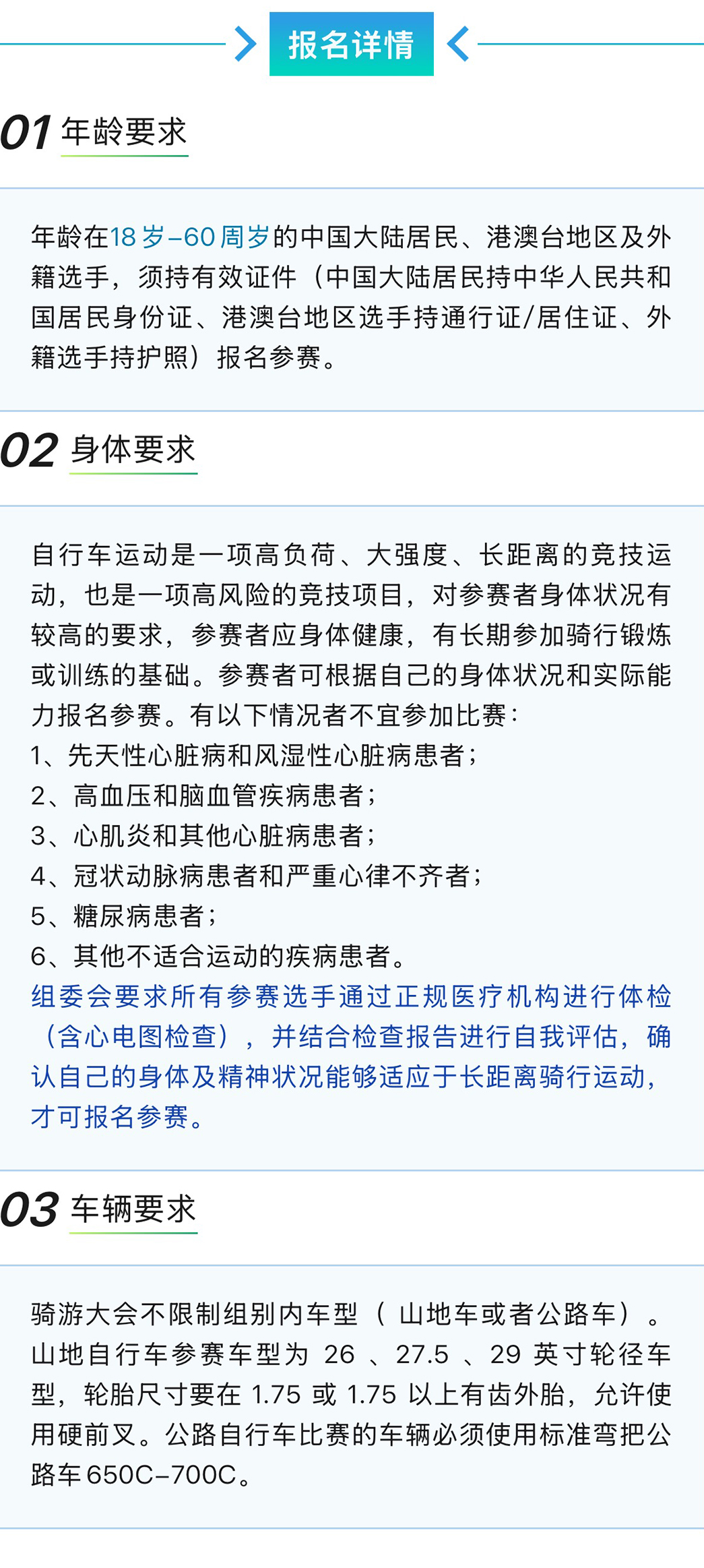 一)参赛者年龄为18-60周岁,身体健康,并确定未患不适宜参加自行车比赛的各种疾病; ( 二)参赛者自备车辆、装备与护具,所有车辆不得配有任何非人力传动、助力装置; ( 三)骑游大会只分组别,不限制组别内车型( 山地车或者 公路车)。山地自行车参赛车型为 26 、27.5 、29 英寸轮径车型,轮胎尺寸要在 1.75 或 1.75 以上有齿外胎,允许使用硬前叉。公路自行车比赛的车辆必须使用标准弯把公路车650C-700C; ( 四)参赛选手必须佩戴获得质量认可的安全头盔、佩戴组委会统一发放的号码布、号码牌(号码牌不得裁剪)、计时芯片,否则不予参赛; ( 五)参赛选手建议穿短裤或紧身裤,以防裤腿卷入链条中发生意外; ( 六)参赛选手顶替他人、证件号码与实际参赛人身份不符,裁判有权取消比赛资格或取消比赛成绩; ( 七)所有参赛报名者在报名时需提供正确有效的信息包括:姓名、有效身份证号码、性别、联系电话; (八)参赛选手需在赛事前一天签到并领取参赛包(包括号码牌、号码布),签到凭身份证原件或复印件(军官证、驾驶证等有效证件),并签署参赛免责声明。如需队友代签到,请提前传真(或拍照发微信)免责声明至组委会,免责声明 需要在赛事当天检录时交到检录员手里; (九)所有参赛人员必须服从赛会工作人员指挥,服从裁判。对比赛成绩有异议,需在比赛成绩公布后30分钟内向仲裁组提出书面申请,并缴纳500元申诉费。 申诉成功后退回申诉费,维持原判将没收申诉费。仲裁组裁决为最终裁定结果; ( 十)所有参赛选手在比赛中必须保持公平、公正的竞赛精神,遵守比赛规则,不得有意冲撞、排挤、刮蹭他人,不做可能引起自己或他人受伤害的冒险行为;如有以上行为裁判有权取消比赛资格,并对上述行为引起的一切责任后果均由肇事者承担。