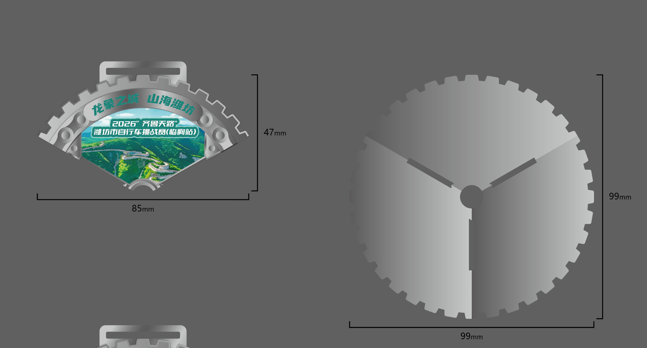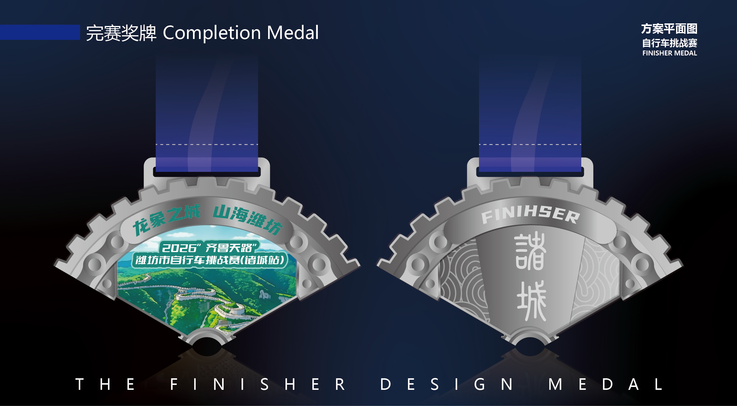 •天路骑行风尚奖(2名):网络评选齐鲁天路精华段骑行姿态最佳、完赛节奏优异、遵守赛事规则的选手,颁发荣誉奖杯+户外骑行装备礼包;• 2026“齐鲁天路”潍坊市自行车挑战赛奖牌特色介绍
