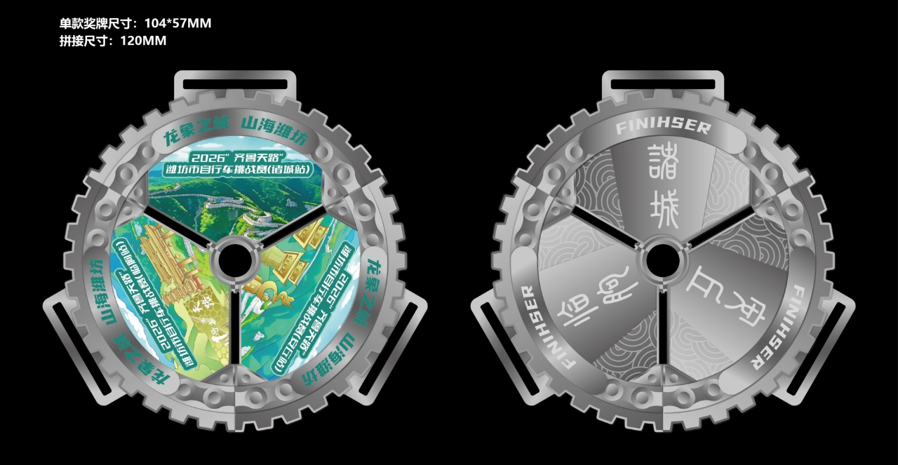 文旅融合:奖牌正面融入齐鲁天路壮美风光与三地标志性文旅元素,将骑行记忆与潍坊“龙泉之城、山海潍坊”的城市底蕴深度绑定。