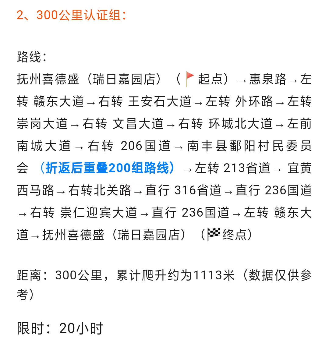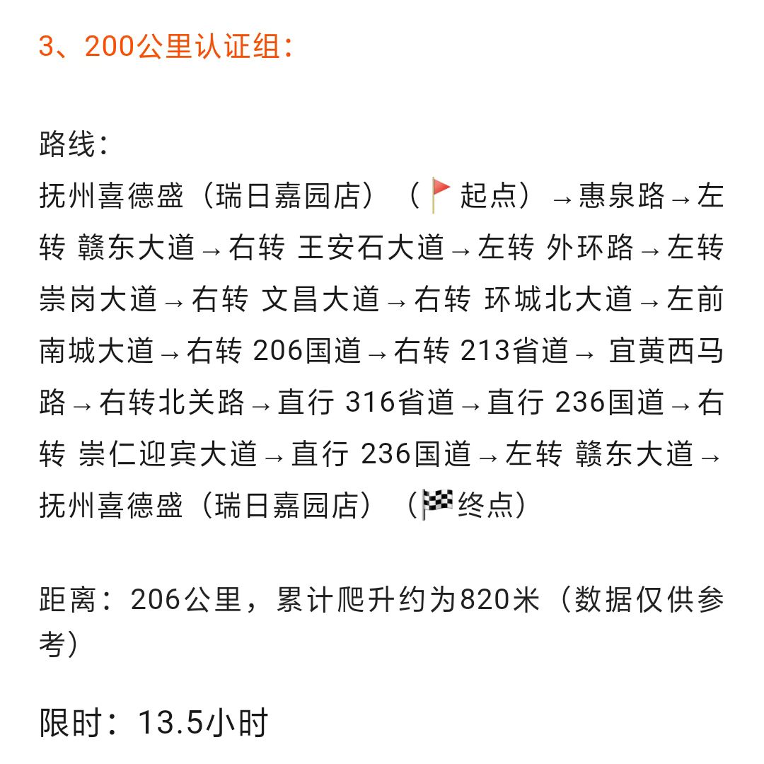 1、签到规则 1) 所有参赛的选手必须按照组委会挑战前公布的路线进行挑战。 2) 所有签到点都必须在规定时间签到,漏签即挑战失败。 3) 请在各个签到点的开关门时间之间进行签到。 4) 各个签到点将检查挑战者的安全装备佩戴状况,没有戴头盔的直接取消资格,早晨8点以前、晚上18点以后没有穿戴反光装备的也取消资格。 5) 签到时,确保志愿者填写“抵达时间”以及盖上“签到印章”。已采用自助签到方式。 6) 签到时,只允许本人面签,替人代签者,本人及代签者都将取消成绩。已采用自助签到方式。 7) 保护好自己的签到卡。丢失签到卡属于挑战失败,不颁发完赛证书。已采用自助签到方式。 2、处罚与奖励 对于以下作弊及恶意犯规行为,一经发现,绝不姑息,严格处理。 1) 抄近路,第一次罚时,第二次罚下。 2) 搭乘交通工具,罚下。 3) 交换选手骑行,罚下。 4) 采用非人力动力来源的车辆,罚下。 5) 代替他人进行签到打卡,代替方与被代替方共同罚下。 6) 在队伍中故意挤撞其他车手,第一次罚时,第二次罚下并保留法律追责权利。 7) 破坏其他选手装备,罚下并保留法律追责权利。 8) 辱骂工作人员及裁判,罚下,情节严重者禁赛。 9) 在赛事中打架斗殴,罚下并保留法律追责权利。 10) 其他恶意犯规根据赛事组委会讨论决定处罚方式。 对于以下行为,核实申报组委会后,根据情况给予奖励。 1) 协助受伤选手就医并联络相关负责人。 2) 发现重大危险源并及时通报组委会相关负责人。 3) 协助组委会或救援队保护事故现场。 4) 协助其他选手维修车辆。 5) 其他情况根据赛事组委会讨论决定。 3、后勤车管理 1) 所有选手或者车队的补给汽车须在组委会进行登记,记录其所属俱乐部、负责人信息、负责人电话。 2) 补给车可以为选手提供各类装备运输工作,包括服装、器材、食品、个人药品等。 3) 补给车不得一直尾随车手进行补给服务,补给车补给的区域必须是在交通道路以外安全的空地等安全区域。 4) 补给车必须配合组委会裁判的沿途临时检查工作。 5) 补给车在起终点或签到点必须遵守现场的停车管理规定,将车辆停放到指定区域。 4、特别注意 1) 通过参加不间断骑行挑战,你增加的不仅仅是毅力、耐力、自我挑战精神,更有思考能力,辨别正确骑行方向的能力。我们不培养傻瓜式骑行挑战者。 2) 补给与维修,挑战者全程均自给自足,也是对挑战者全面能力的考验,包括心理承受能力、突发事件处理能力、自行车维修能力。挑战者需要掌握一定的维修技能。 3) 参赛选手应以安全骑行为第一的原则。 4) 所有参与者出发前必须签署免责协议。 5) 建议穿骑行服、骑行裤、戴自行车手套以增加骑行舒适度和一定的安全性。 6) 建议所有参赛选手将手机、码表、照明装备等设备充足电,适当自备电池、创可贴等应急物料。 7) 如挑战过程中,因个人体能原因或车辆机械故障等情况放弃挑战,请及时告知组委会,并可自行安排离场。 8) 开放道路骑行,请务必遵守交通规则,严禁闯红灯、逆行等行为。如发生交通事故或摔车等意外情况,请及时告知组委会并拨打122或120报警电话。 9) 本次活动保险将由组委会统一购买,请参加挑战的选手报名时仔细核实姓名和证件号码等个人信息。为更好的保障个人安全,有条件的选手亦可自行购买高额度意外保险。 10) 活动裁判权及最终解释权归耀骑中国(BRM China)所有。