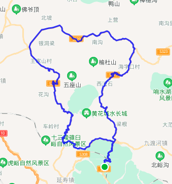 骑行路线:起点—慈悲峪—黄花城—四海—永宁—解字石—分水岭—慈悲峪—终点,全长118公里。路书编号:778310
